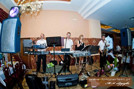 Wokalistka, 3 wokalistów Bardzo szeroki repertuar,saksofon,akordeon gitary, klawisze, profesjonalne nagłośnienie i oświetlenie, biesiada przy stołach - przy akompaniamencie i śpiewie, wyprowadzenia u Młodych, liczne zabawy i konkursy, również KARAOKE. Płyty DVD i CD do wglądu.