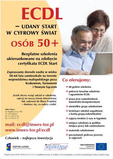 Zapraszamy wszystkie osoby między 50 a 64 rokiem życia zamieszkałe na terenie województwa małopolskiego poza Krakowem, Tarnowem i Nowym Sączem na bezpłatne (finansowane w całości ze środków Unii Europejskiej oraz budżetu państwa) szkolenia z zakresu podstaw obsługi komputera zakończone uzyskaniem międzynarodowego certyfikatu ECDL.